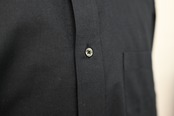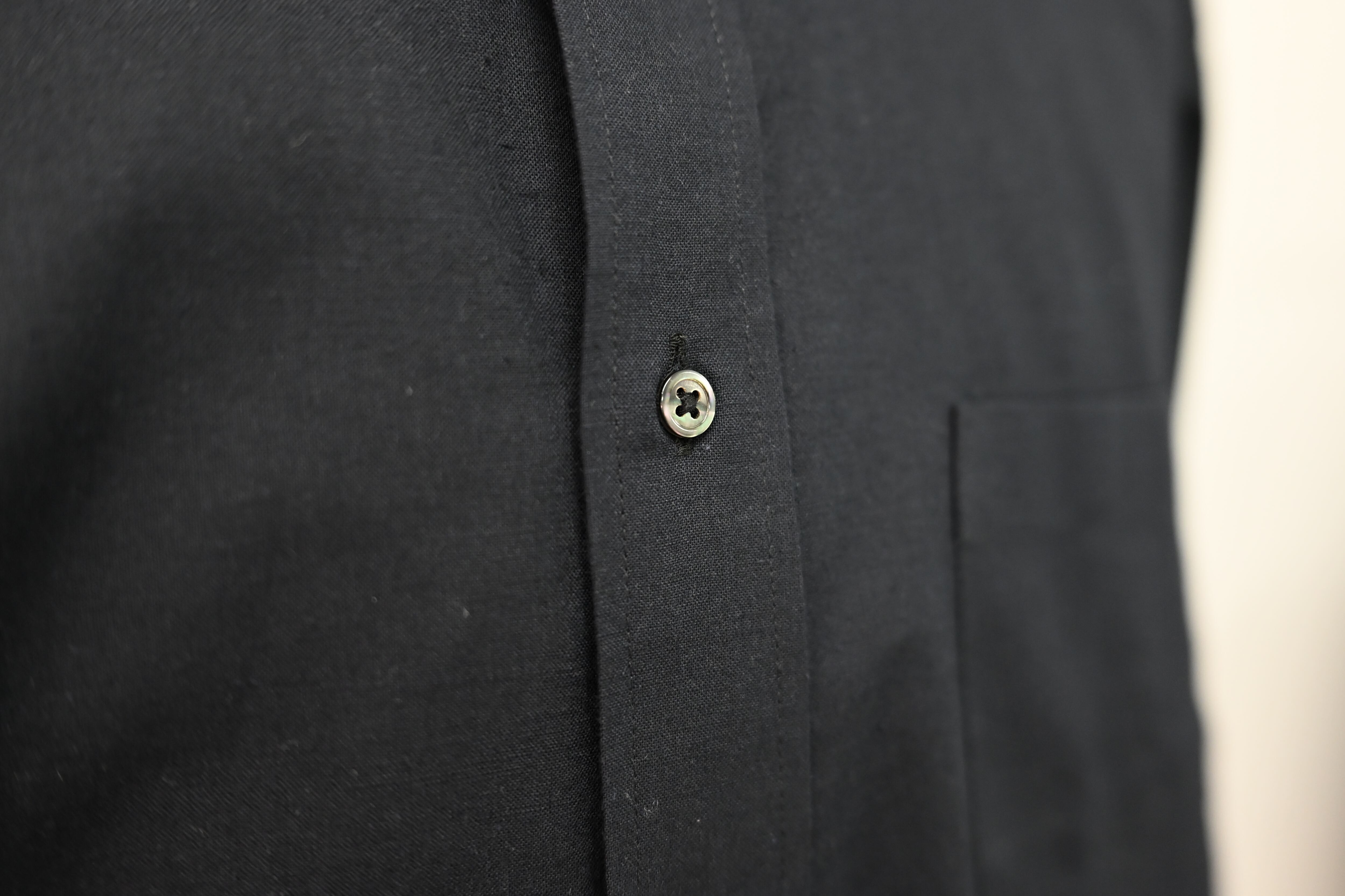 黒蝶貝ボタン: 深い色合いの生地に、黒蝶貝のシックで上品な光沢が映え、高級感を添えています。