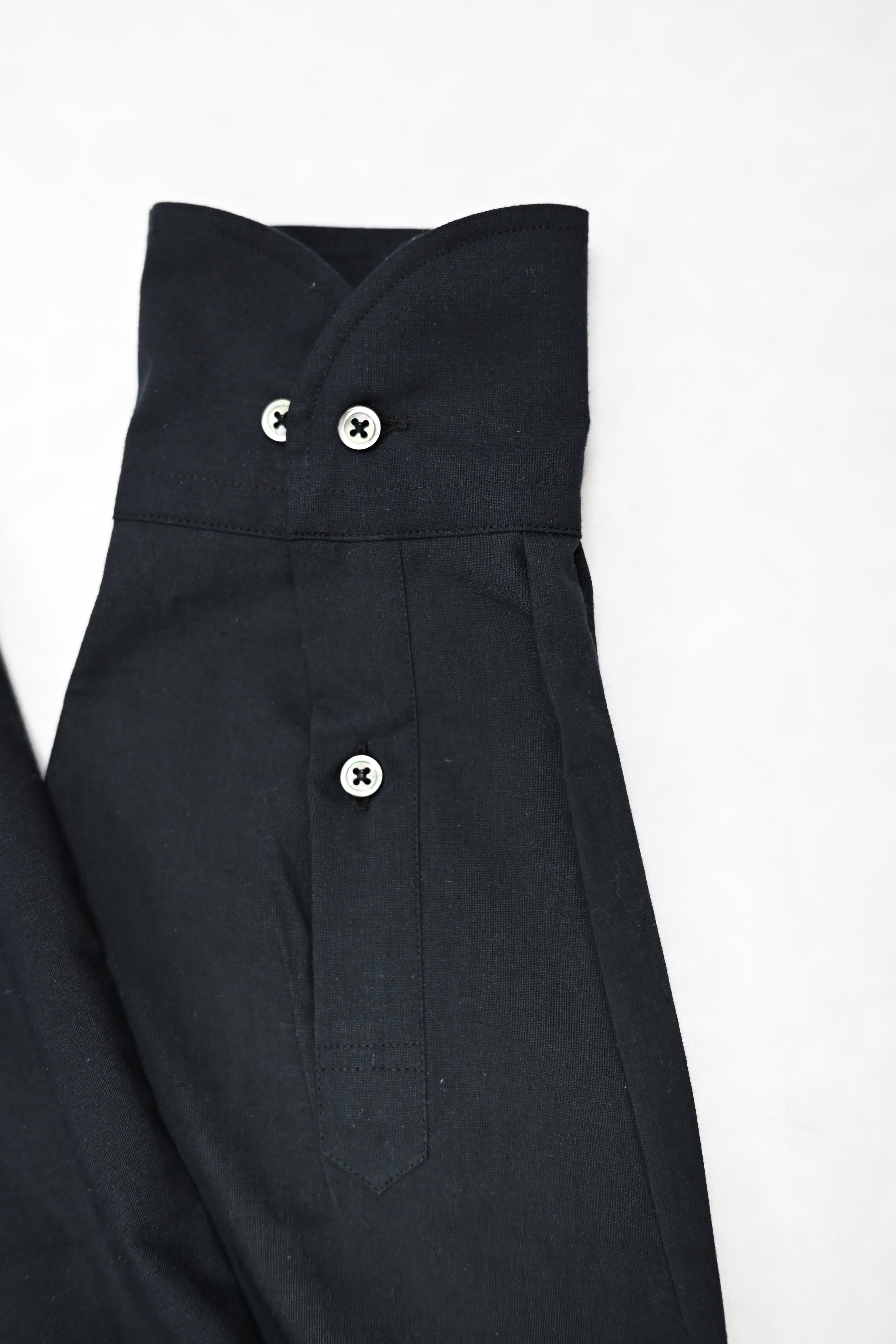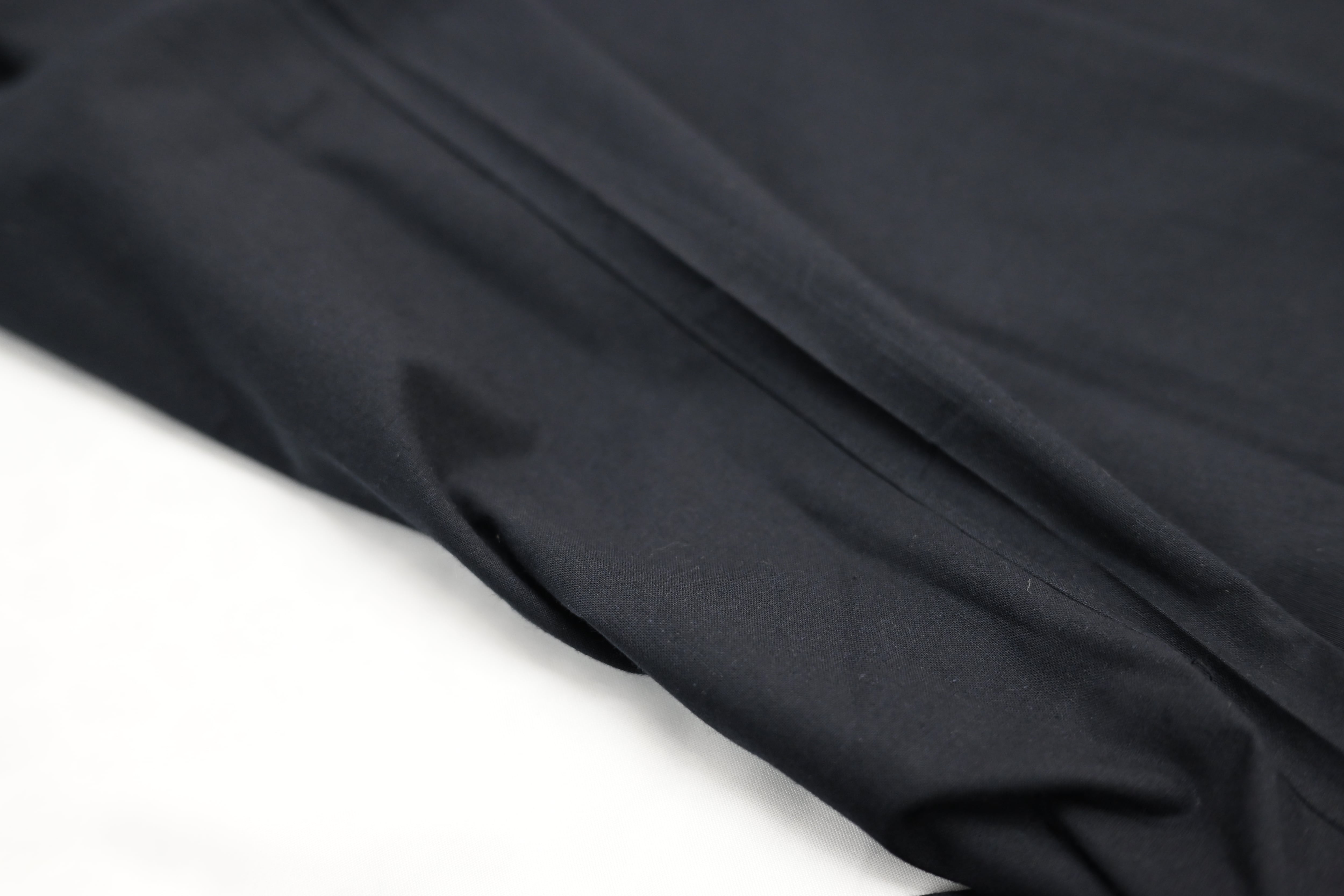 使用されているのは、ヴィンテージのパネルマーカー生地。墨黒のような奥深い風合いと、長年の時を経てきたことによる独特のムラやネップが魅力です。非常に味わい深く、通常の生地では味わえないミリタリーのタフさと時の経過を感じさせる豊かな表情を持っています。