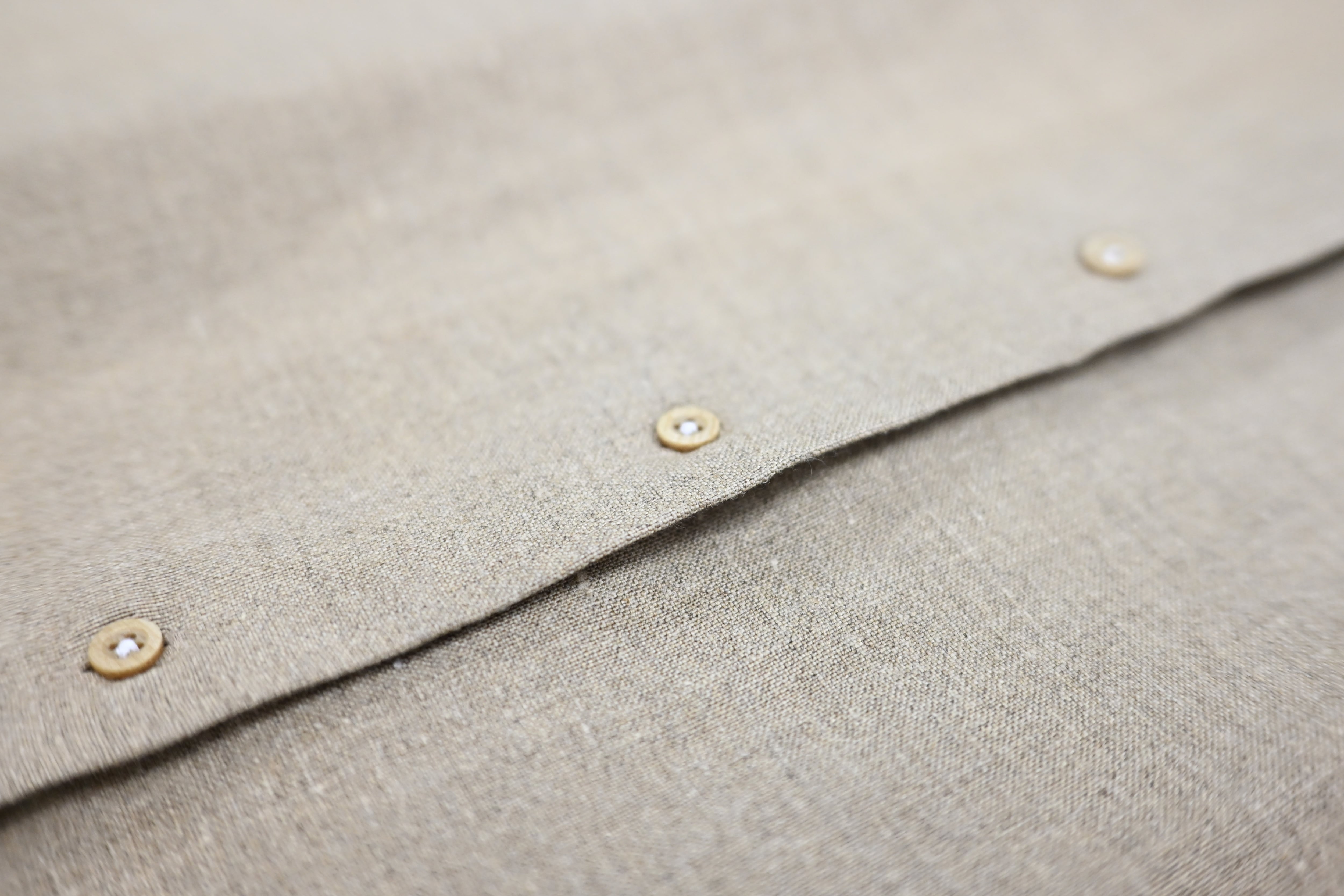 リネン特有のシャリ感と、コットンライクなふっくらとした柔らかさを兼ね備え、使い込むほどに肌に馴染むナチュラル感のある生成りの色合いが魅力です。
