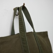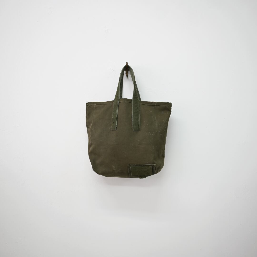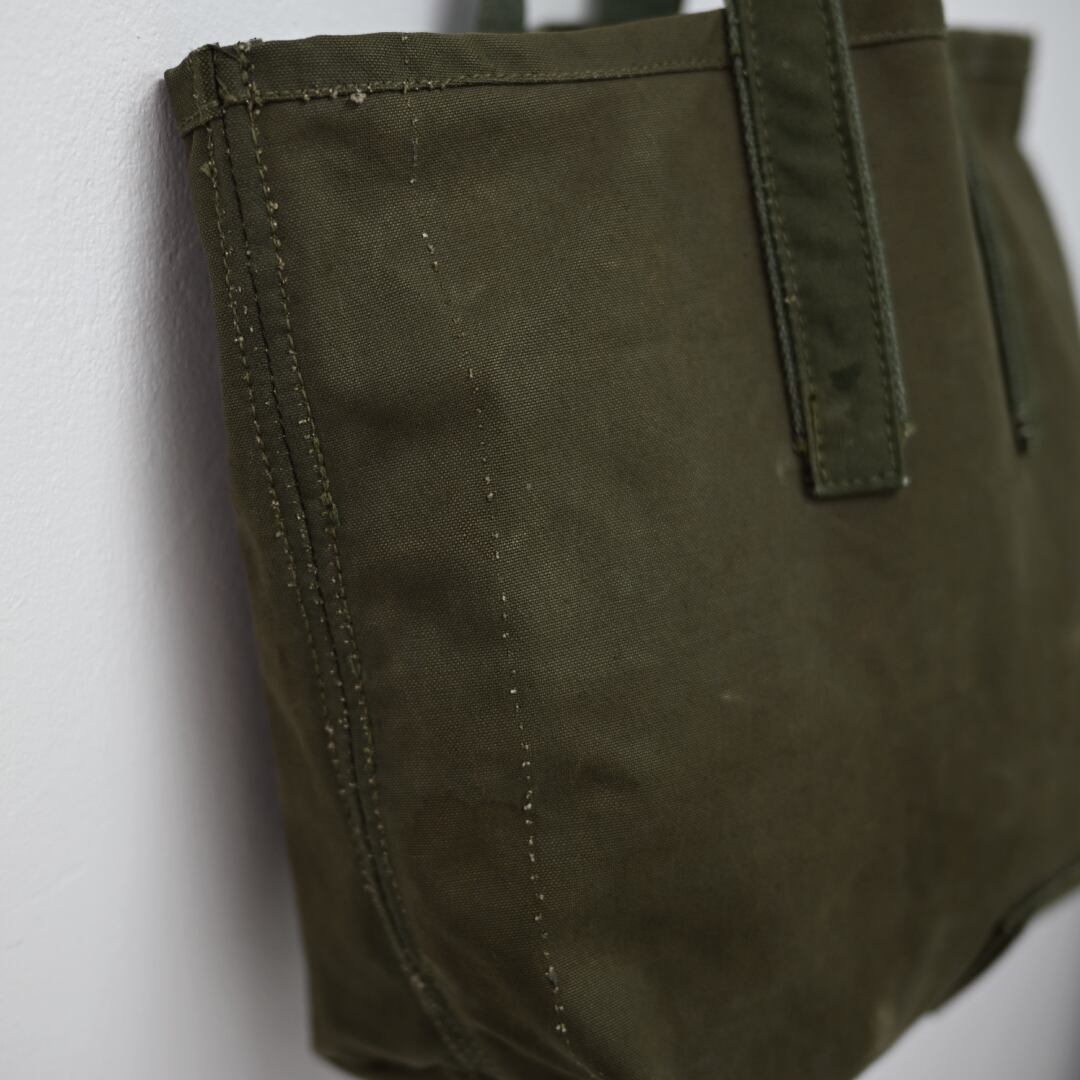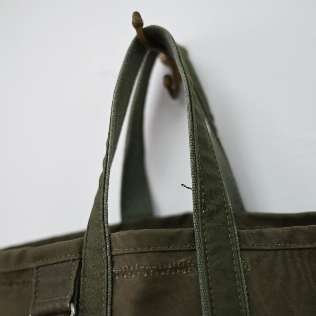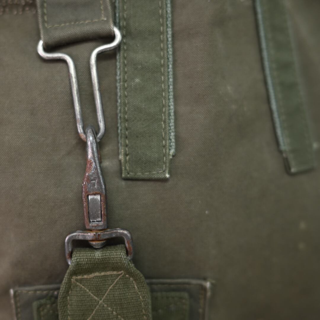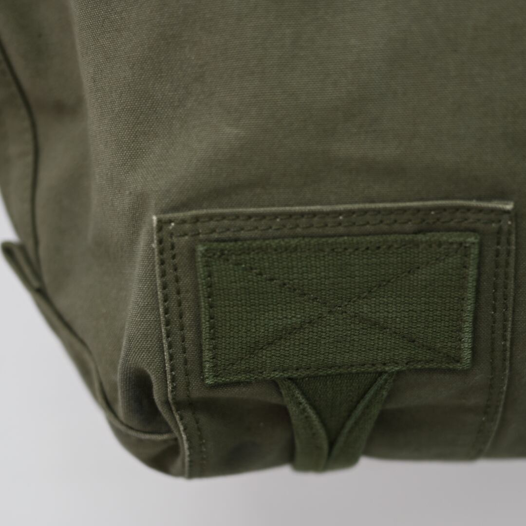 長年使い込まれた生地のエイジング感は、ヴィンテージならではの深みのある表情を見せてくれます。英国軍で使用されていた当時のパーツが、そのまま活かされており、傷や汚れ、色の変化といった細部に至るまでの経年変化が、このバッグに唯一無二の表情を与えています。一つとして同じものがない、特別な個性となっています。縫製にもこだわりがあり,当時の縫製糸と近い太さの7番手のコアヤーン縫製糸を使用しています。コアヤーン縫製糸は、芯となる部分に強度のあるポリエステル長繊維を使用し、その周りを綿の短繊維で覆った複合糸です。堅牢でありながらもヴィンテージの雰囲気を忠実に再現しています。