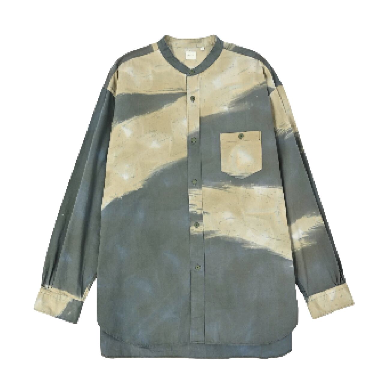 京都の染色職人の技術を継承し、新しい感性と創造性によって生み出されたオリジナルテキスタイルを使用したオーバーサイズのバンドカラーシャツ。